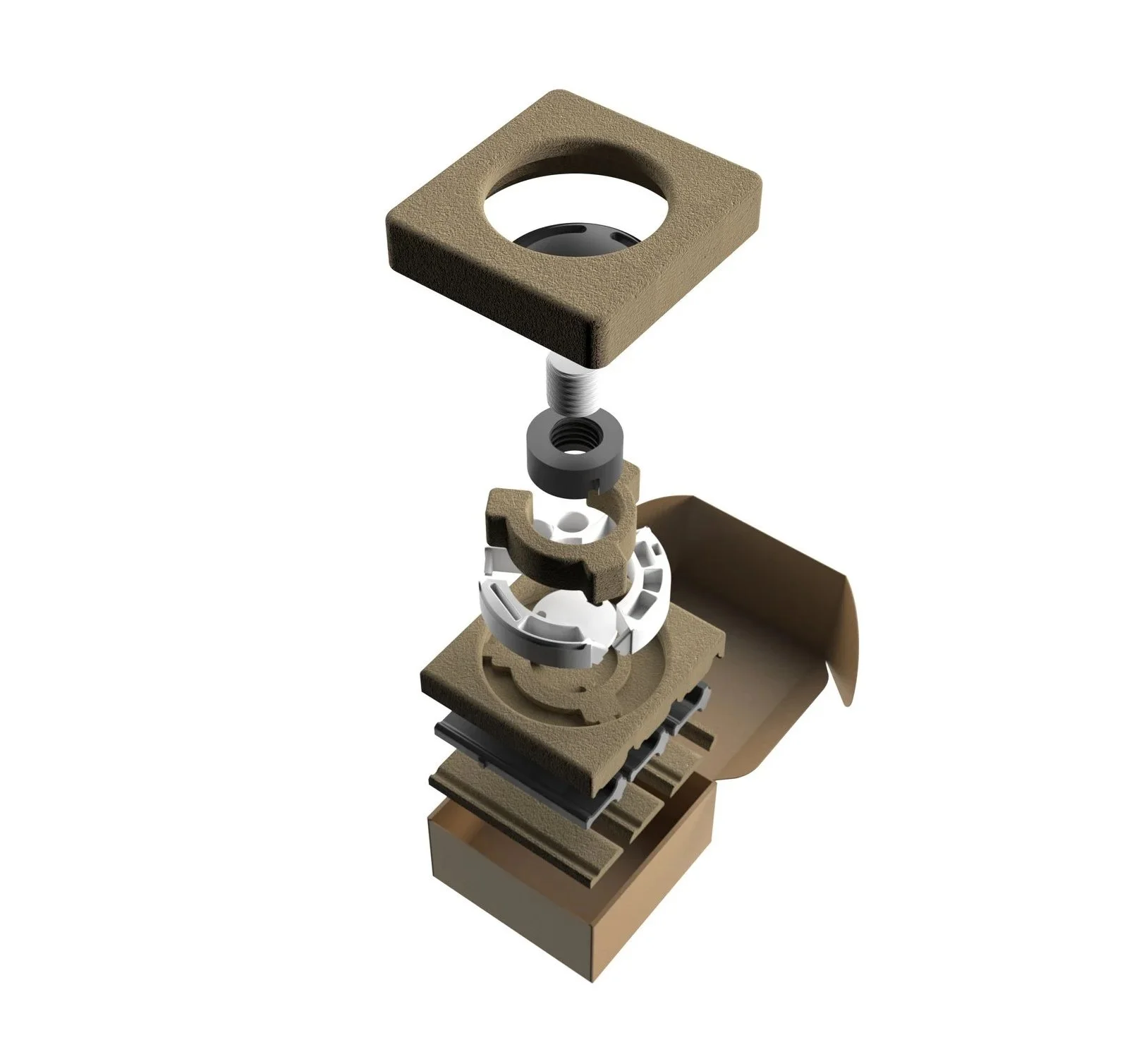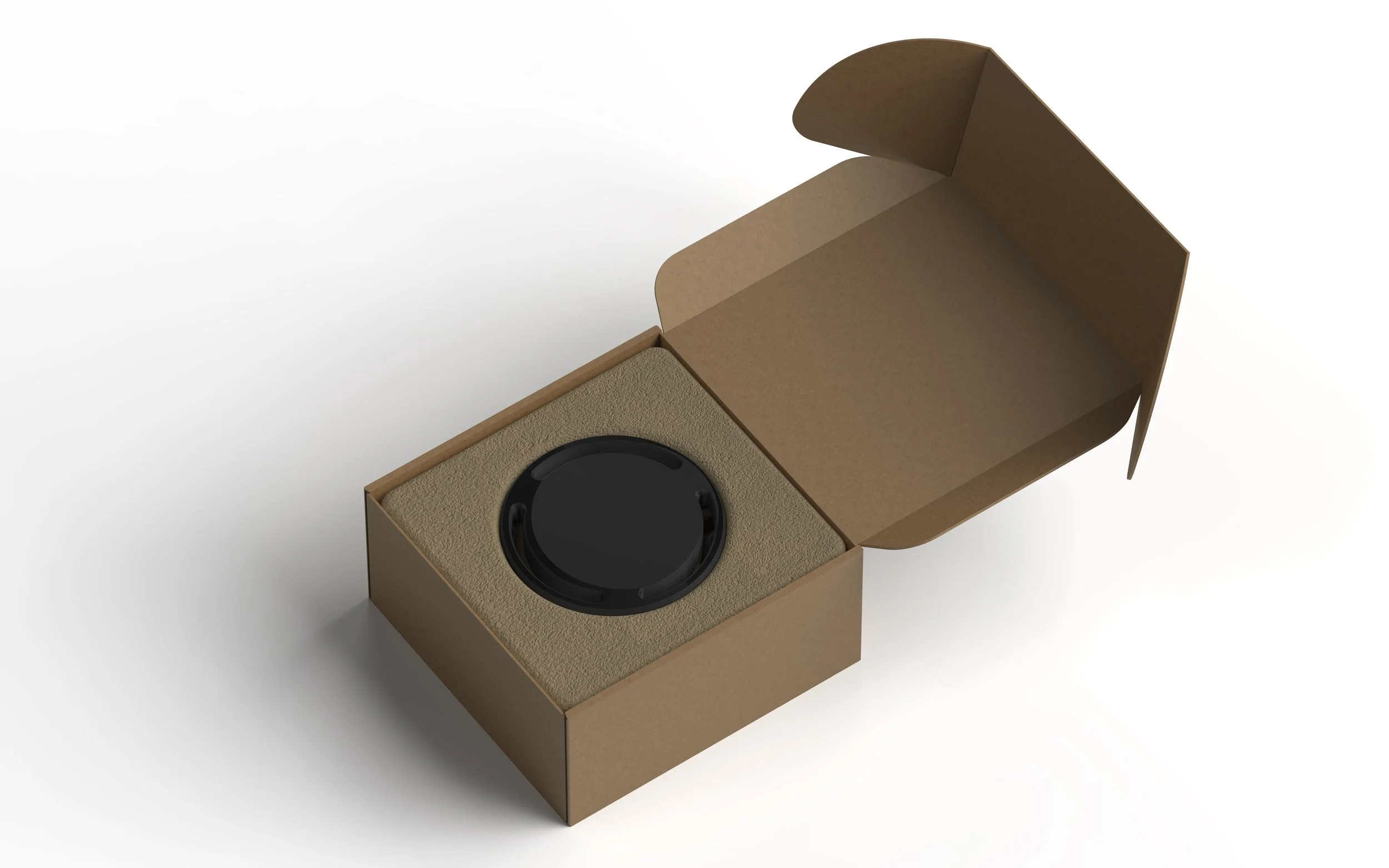 Carrier ships flat with recycled pulp fiber packaging that securely cradles each component. Careful layouts and minimal materials deliver both shipping efficiency and a refined, intentional unboxing experience.
