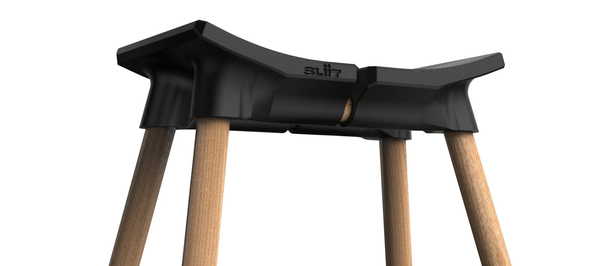 The seat, 3D printed in PLA, leverages additive manufacturing to maximize tensile strength while minimizing support waste. The ash wood legs, chosen for their balance of strength and flexibility against impact, make the stool both durable and lightweight.