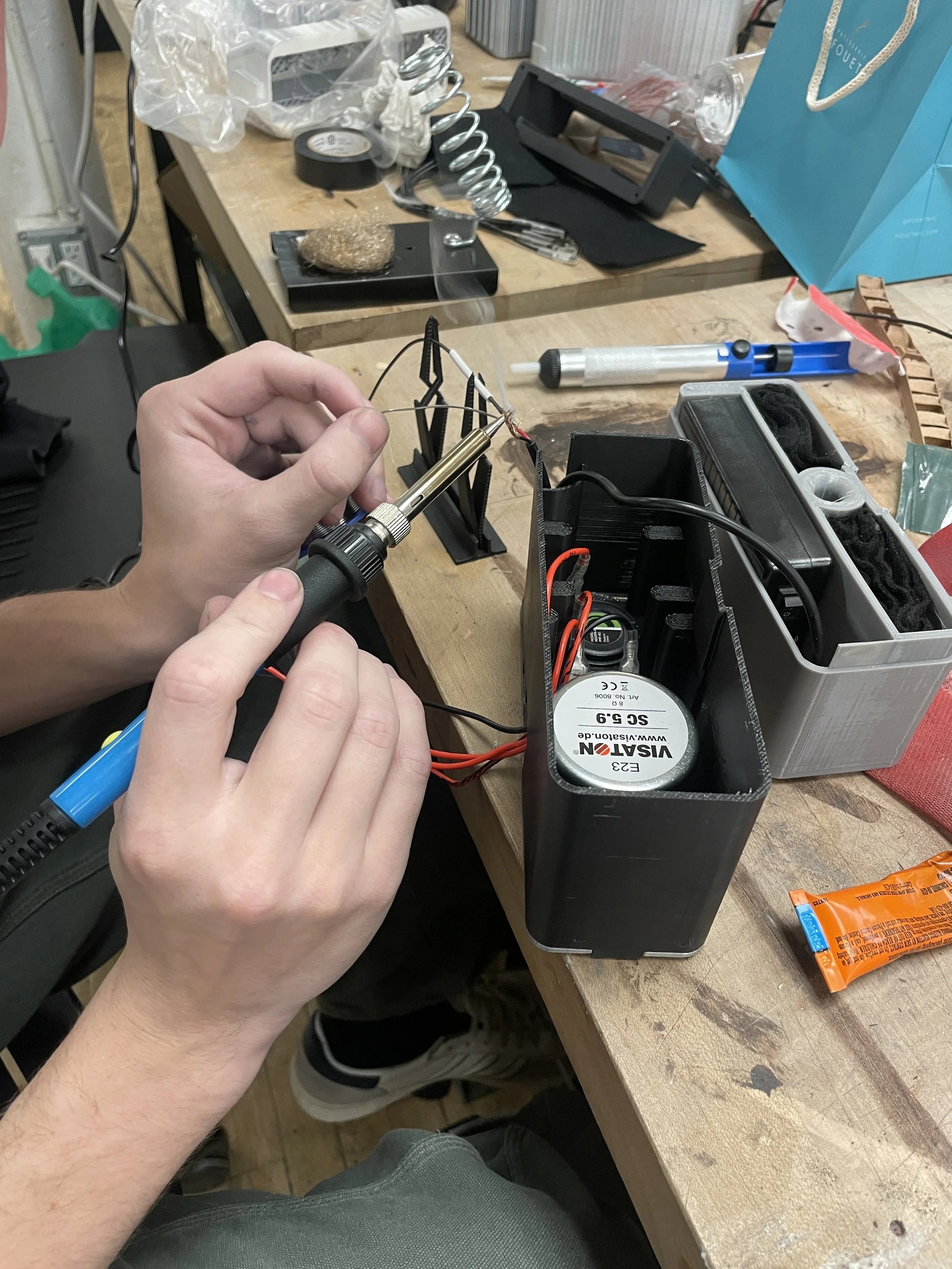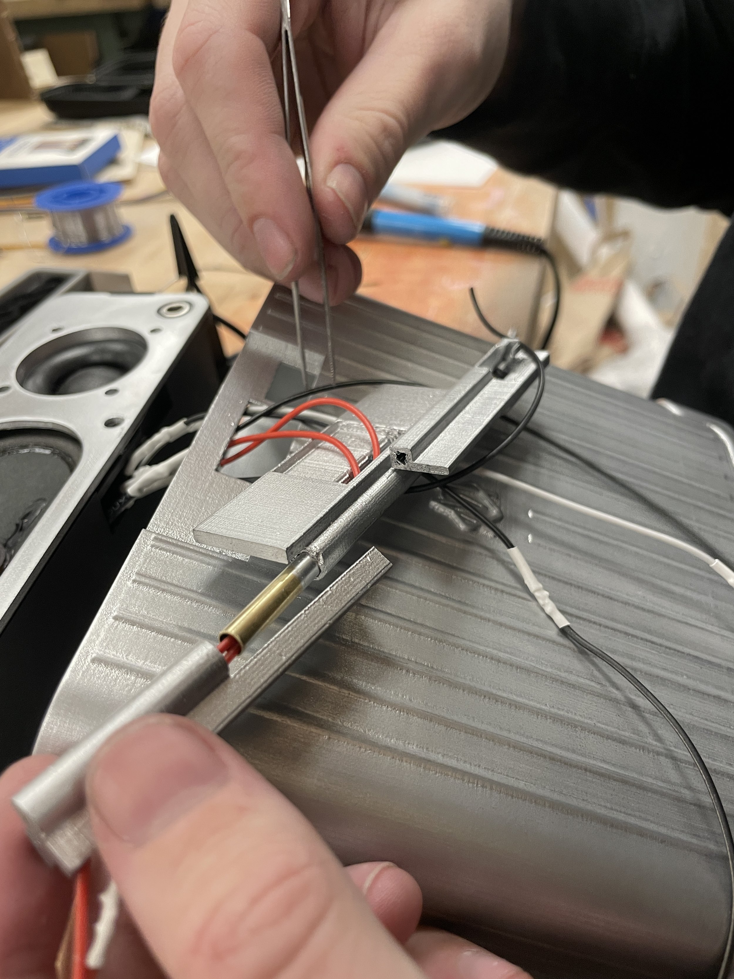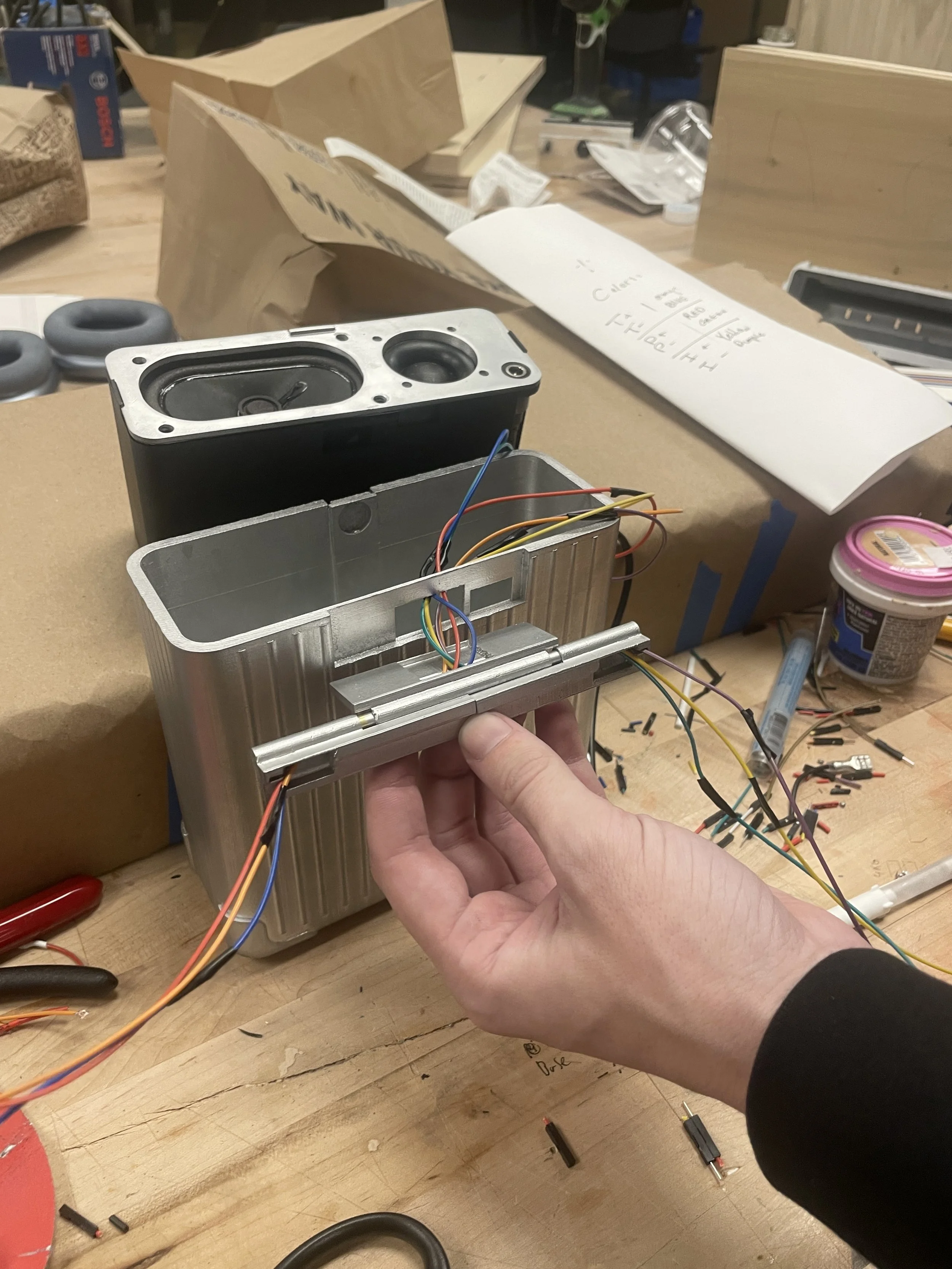 The prototyping process involved multiple iterations to integrate speaker components into two distinct enclosures effectively. One of the major challenges was engineering a solution to route the wiring through a hinge mechanism, similar to the functionality found in laptops. This required experimentation and innovative problem-solving.